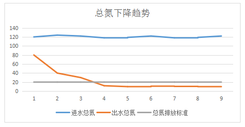 采用邁葳生化修復方案后,出水總氮由80mg/L持續下降,最終穩定出水TN在10mg/L左右,達到一級B排放標準。