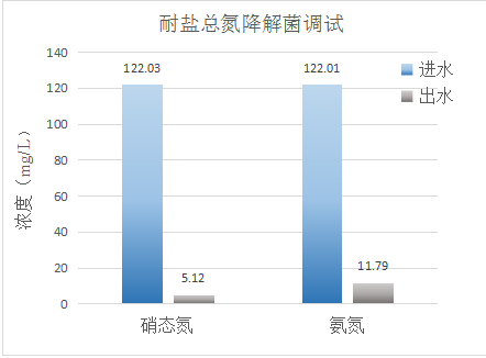 糧果廢水鹽度2%,30℃下經(jīng)過我司耐鹽總氮降解菌的生物調(diào)試后,硝態(tài)氮的去除率超過95%、氨氮的去除率超過90%。
